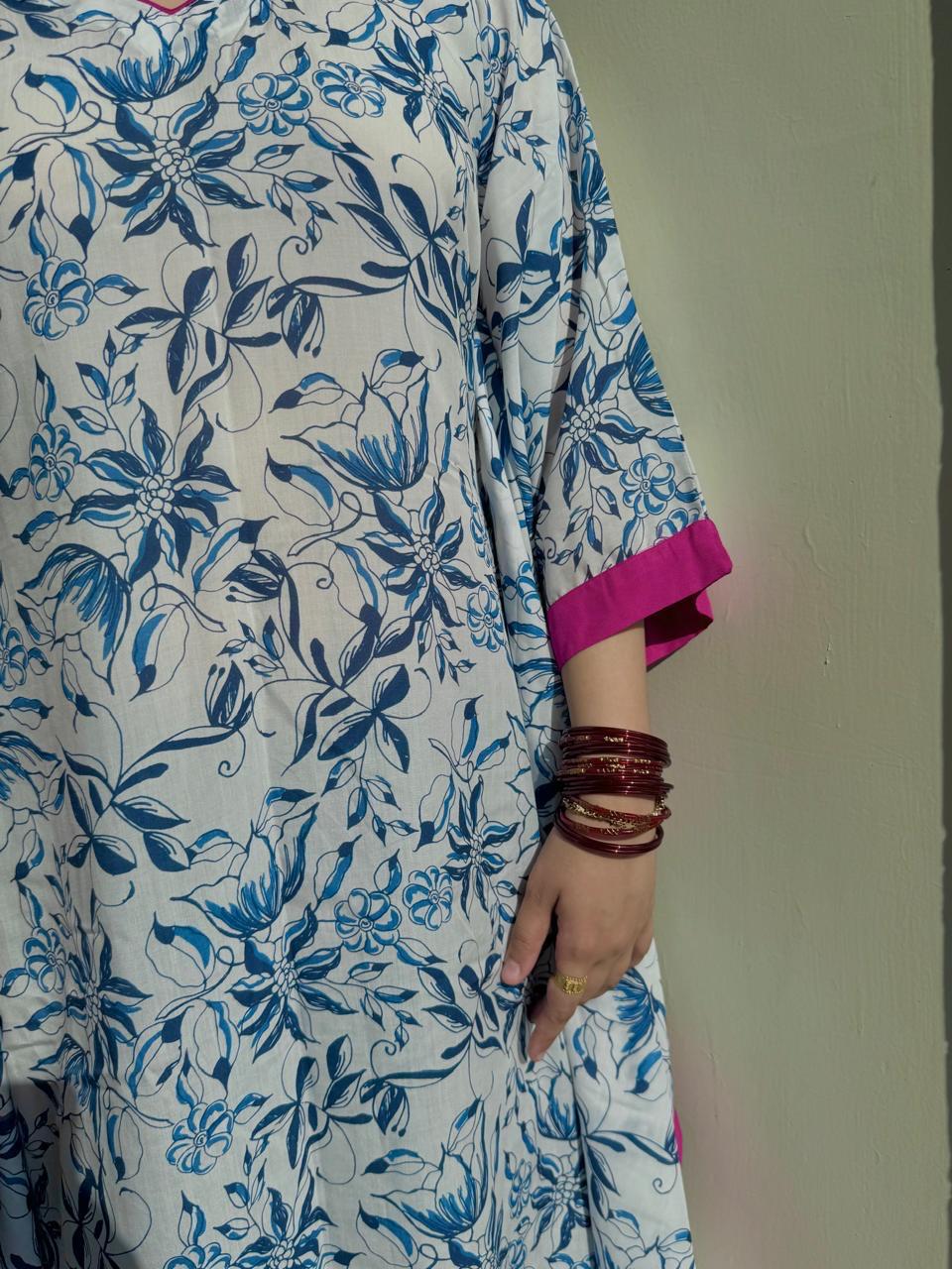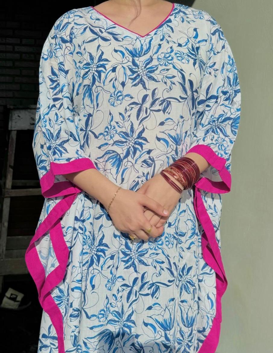 Grace meets freshness in our ZAHARA Kaftan, where soft cotton and delicate floral prints come alive. With vibrant pink edges adding a playful contrast, this flowy silhouette brings effortless elegance to every moment.